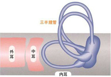 耳の奥には内耳という部分があり、その中の前庭と呼ばれる場所に「三半規管」という装置があります。三半規管には、三つの輪のようになった管がついていて、管の中は液体(リンパ液)で満たされています。